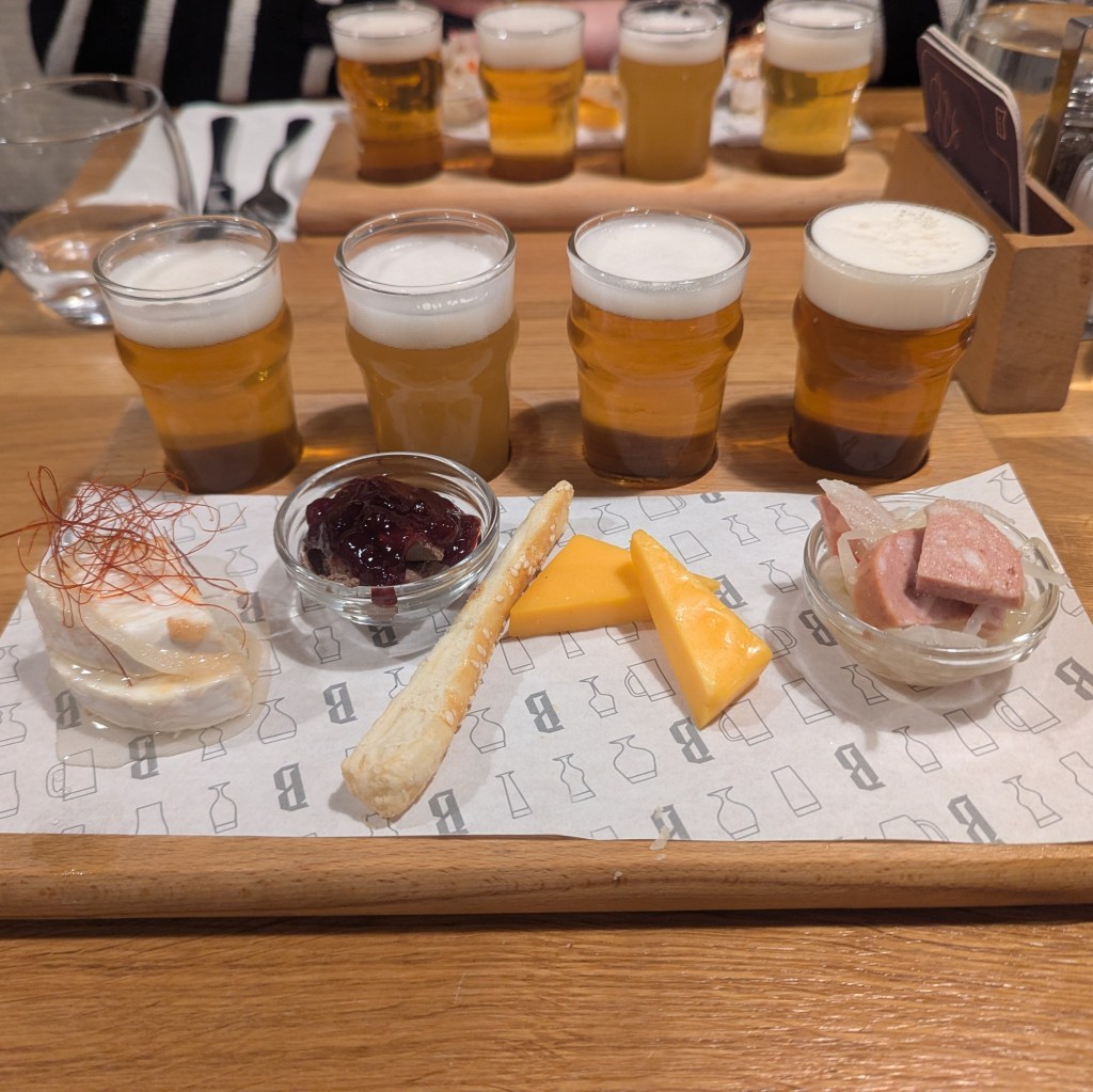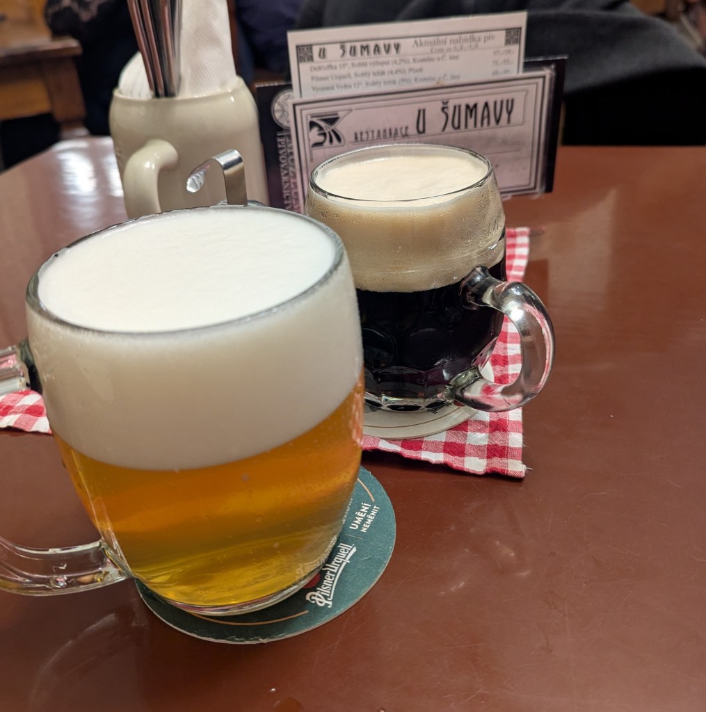 For dinner we stopped by Pivovarský dům Benedict, a brewery taproom near our hotel. I was feeling particularly full from the last couple of dense meals plus the beers, but the show must go on. We each ordered a beer flight composed of four small beers each paired with a small starter: A classic pilsner with pickled cheese, a hefeweizen with a terrine, then two different IPAs, one paired with a cheese, the other sausage and sauerkraut. Out of sheer fullness I couldn’t hack another beer with my main and decided I had to try and walk off this lethargy.