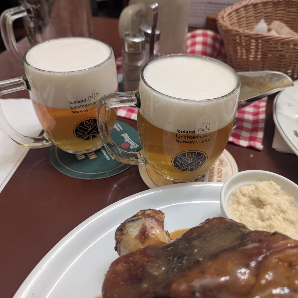 But what about the beer? I felt obliged to order a Pilsner Urquell first. However, our waiter, after hearing this was our first night, wisely insisted we try both the light and dark beers from Černokostelecký Pivovar, to go with the pork knuckle and the duck. This was such a good opener for what to expect in Prague and made for an incredibly soul nourishing experience.